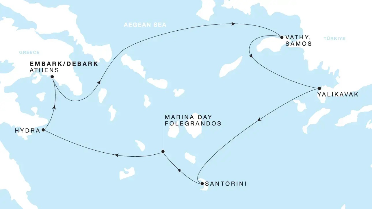 ヴァシでは素朴な漁村の風景とムスカットワインの香りを感じ、ヤリカヴァクではエーゲ海の深い青に抱かれる洗練されたマリーナの雰囲気を楽しみ、フォレガンドロスのマリーナデイでは切り立つ断崖と静かな入江がつくる穏やかな海時間に浸り、サントリーニでは白壁の家並みとカルデラを望む劇的な景観に心奪われ、石造りの屋敷と小さな港町の情緒が残るイドラでギリシャの静けさに包まれながら、エーゲ海の個性ある島々の魅力を連続して味わう5泊です。