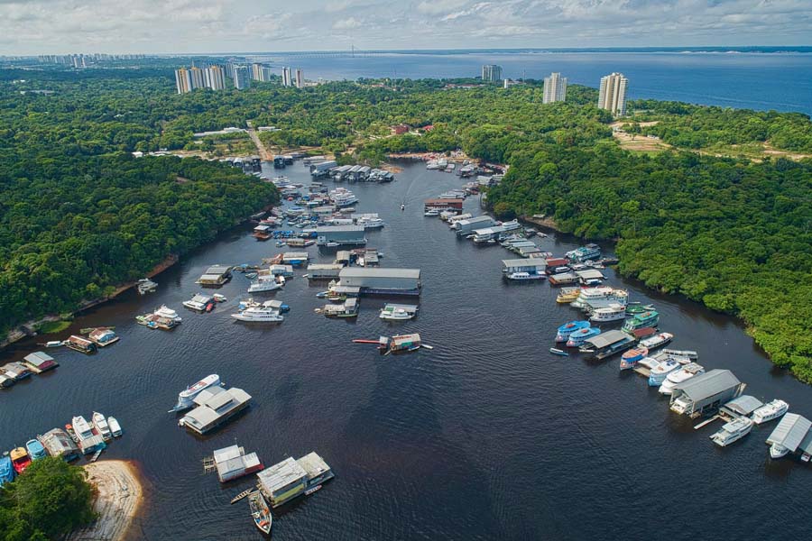 大西洋に面した河口から上流へ約1,700km、アマゾン川本流とネグロ川が合流する付近にブラジル北部の経済の中心としてあり、アマゾン観光の拠点都市でもあるマナウスがあります。河口エリアよりもわずかに30m標高が高い中流域では緩やかに流れるアマゾン川を眺めることができ、さらに支流に分け入れば、ジャングルも探検することができる、バラエティに富んだ風景が見られる地域です。大型のクルーズ客船が遡上できるのは通常マナウスまでです。