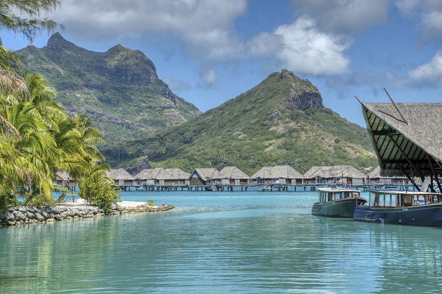ボラボラ島は、タヒチの島々とモーレア島から飛行機でわずか50分、明るいブルーとグリーンのパレットのようなラグーンに囲まれた伝説の島。ボラボラ島の中央には、オテマヌ山とパピア山がそびえ立ち、完璧な白い砂浜の先には、カラフルな熱帯魚がサンゴの園を彩り巨大なマンタが優雅に泳ぐ青い海が広がります。