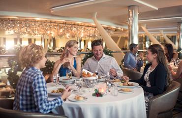”世界の職を旅する”をテーマに朝・昼・夕食とエレガントなメニューを提供します。クルーズ中に1度しか出されないこだわりでゼロから造りあげたオリジナルメニューや世界各地の寄港地にまつわる季節限定のメニューも。