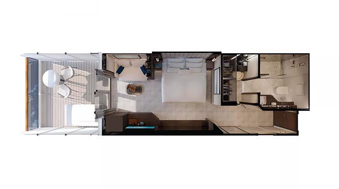 ツインまたはダブル / ベランダ・シャワー付 / 63㎡+テラス14㎡ / 7・8・9階