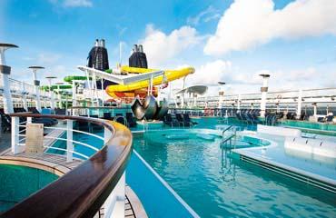 2つのプール、5つのジャグジー、子供用プールのほか、200フィートある洋上初のボウルスライド「エピック プランジ」など、複数階の高さのウォータースライドを3つご用意しています。