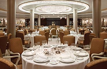「グランドダイニングルーム」は、格調高くもカジュアルな雰囲気を持ち合わせています。10種以上の前菜・スープ・メインディッシュを日替わりでご提供するほか、キャニオンランチスパの料理やビーガンメニューなども取り扱っており、船内ナンバーワンのバラエティをお楽しみいただけます。