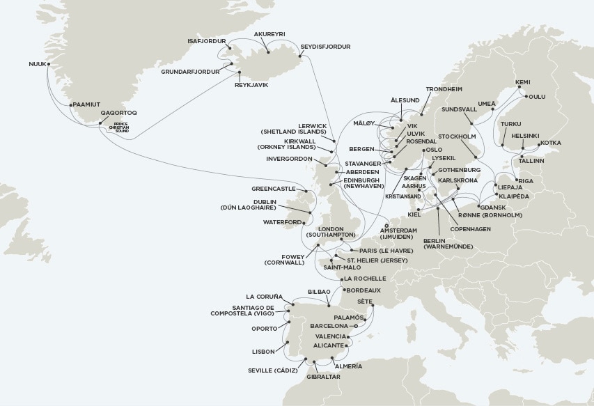 | エリア | 西地中海 | イベリア半島 | 英国の島々・アイルランド | アイスランド・グリーンランド | ノルウェーフィヨルド・沿岸急行船 | 北欧・バルト海 | ||