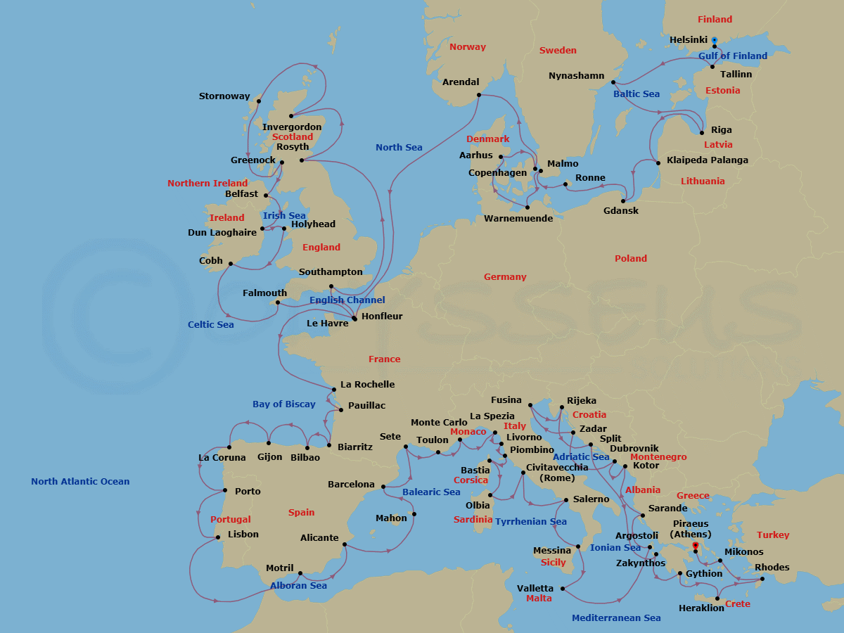 | エリア | 北欧・バルト海 | イベリア半島 | セーヌ川 | 英国の島々・アイルランド | 西地中海 | 東地中海・エーゲ海・黒海 | ||