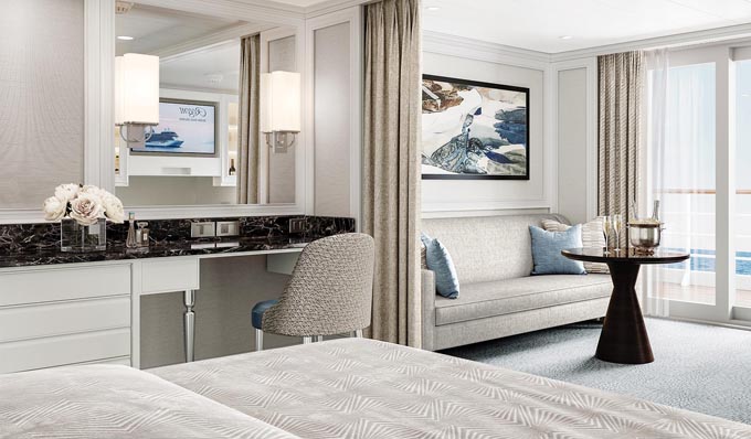 息を飲むようなデザインやクルーズ界最大の船内のゆとり、究極のオールインクルーシブサービスを、世界最高のラグジュアリー船として新たに加わる船内で昼夜を問わず存分にお楽しみいただけます。