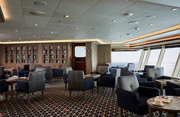 床から天井まで全面窓のラウンジです。船内から心地よく外の景色を楽しむ事が出来ます。午後はアフタヌーンティー、夜はダンスや音楽演奏もここで開かれることもあります。