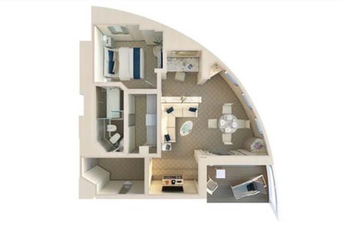 海側ツインまたはクイーンサイズ / ベランダ・バスタブ付 / 40㎡+ベランダ8㎡ / 5・6・7階